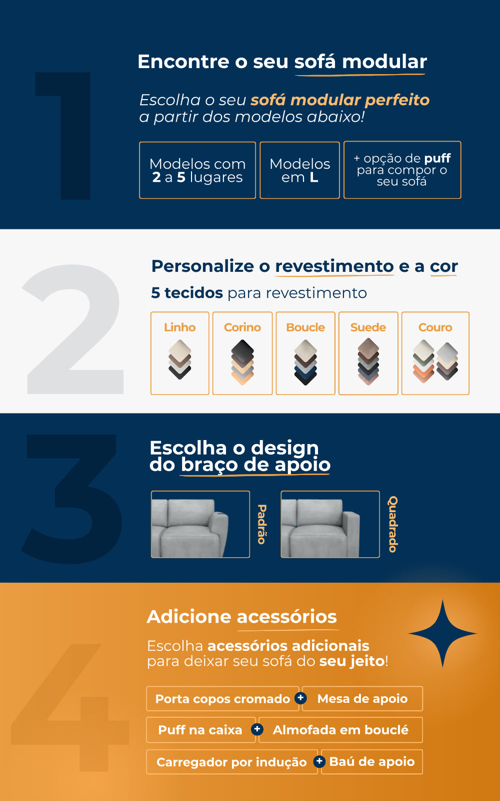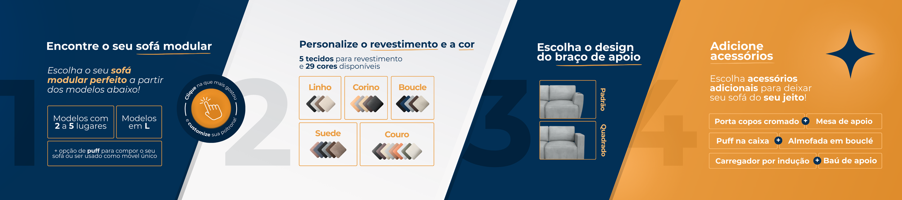 Os preços variam de acordo com o modelo e acessórios de seu sofá modular. Para ver, basta entrar na página do sofá e escolher os acessórios que o preço vai atualizando na hora.